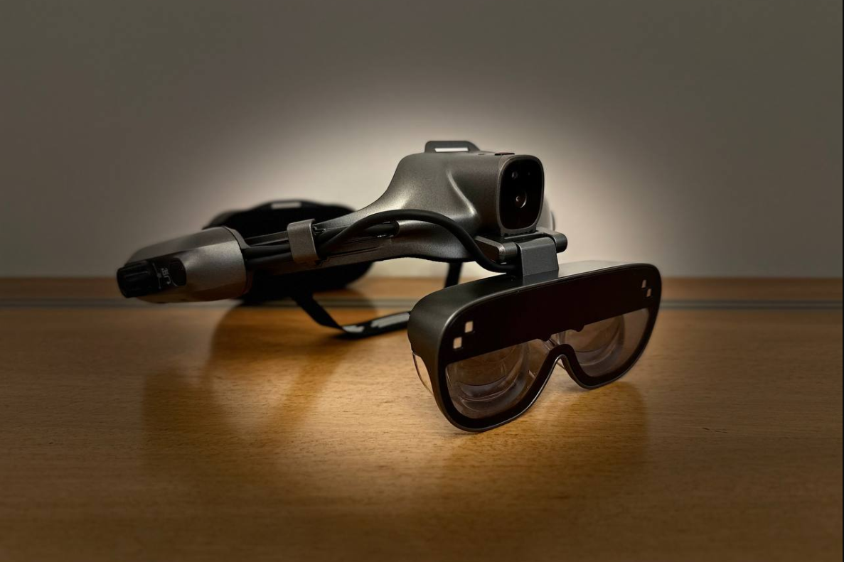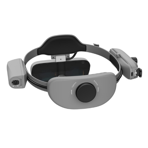 Goolton C3000 glasses are used without a helmet, are worn directly on the head, secured at the back with a rotary dial, and feature an additional top strap. The device is relatively lightweight—less than 350 grams—and has soft headband elements, allowing for extended work without fatigue or discomfort. Two flip-up Micro OLED displays with high transparency and brightness provide a 40-degree field of view both indoors and outdoors. In very bright ambient lighting, optional tinted lenses on magnetic mounts can be used.