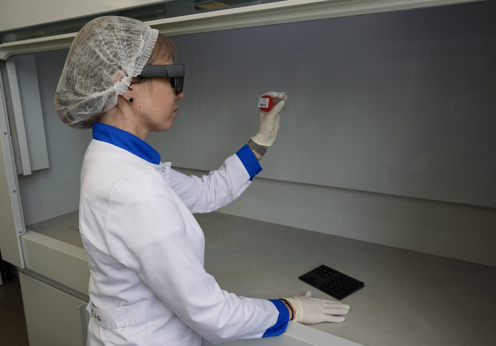 Специалист лаборатории надевает AR очки, выполняет авторизацию и приступает к первому шагу лабораторной диагностики – маршрутизации лабораторных проб.