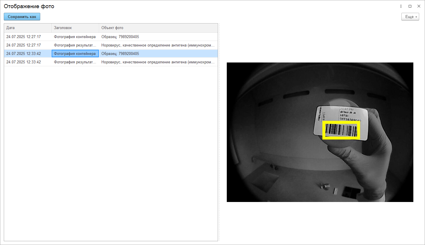 Пробы идентифицируются путем сканирования уникального штрих-кода. По коду на экране очков в режиме реального времени отображается ключевая информация о пациенте и запланированных исследованиях. Специалист лаборатории выполняет проверку данных, сортирует выбранные пробы и переходит к новому образцу.